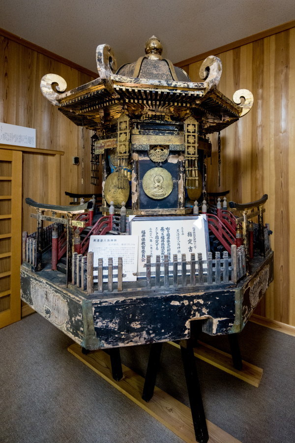 この黒漆塗りの八角神輿は、神仏習合時代の貴重な御輿の姿を伝える県内最古の神輿といわれる。